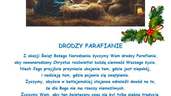 5. Msze Święte Pasterskie będą odprawione w Wigilię Bożego Narodzenia o godz. 2000, 2200 i 2400. Msze Święte w pierwszy i drugi dzień Świąt Bożego Narodzenia – zgodnie z rozkładem niedzielnym: 830, 1000, 1130, 1245 i 1700.
